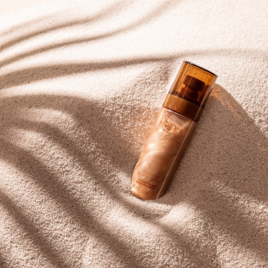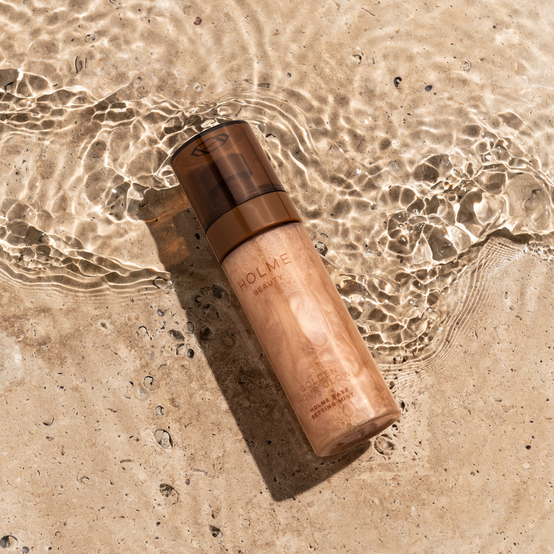 The Holme Beauty Setting Spray is translucent, infused with soft light-reflecting particles that give the skin an incandescent, soft-focus glow, as though it's been caught in golden hour light at any time of day.